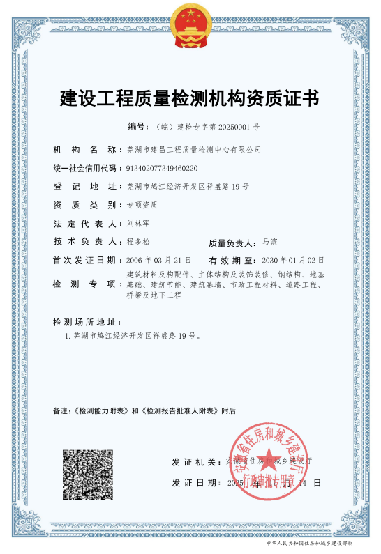 近日,建工检测公司所属建昌检测成功取得道路工程、桥梁及地下工程两项建设工程质量检测资质。这一突破性进展,标志着建昌检测正式集齐建设工程质量检测领域全部九大项资质,成为安徽省内少数具备建设工程质量检测全领域检测能力的标杆企业,也成为省内合肥市外首家实现“全项资质”的地市检测机构。